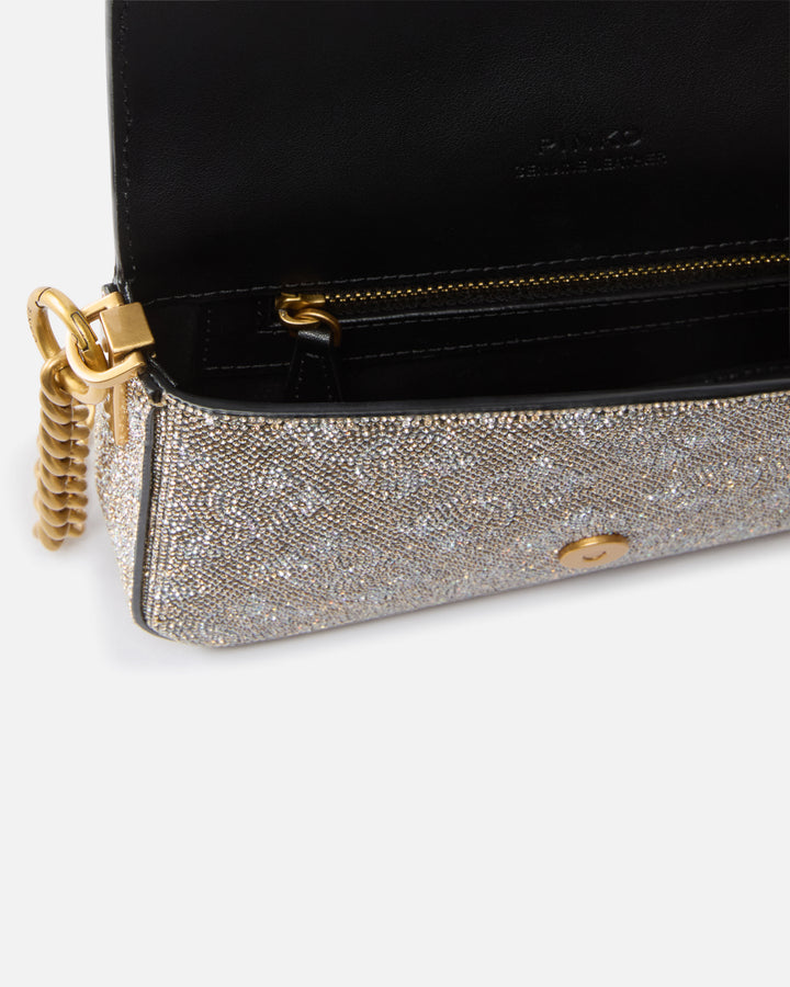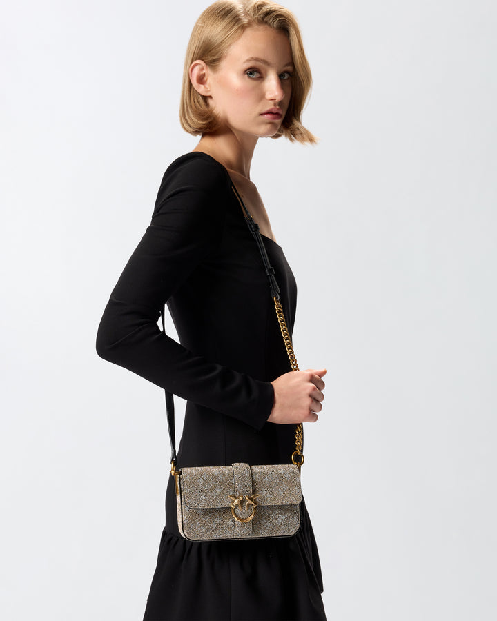 Baby Love Bag Slouchy leather shoulder bag covered entirely in rhinestones of different colours, forming an all-over monogram motif for the perfect sparkling look. Featuring an adjustable leather and chain strap for shoulder or crossbody wear, the bag is very refined and practical. The flap fastening is accompanied by the timeless buckle featuring the Love Birds Diamond Cut logo. The accessory features a cotton drill-lined interior and a zipped slip pocket. Activate your PINKO bag: verify the authenticity of your product and access a personalised experience by scanning the Love Birds embroidery on the back of the bag with your smartphone!