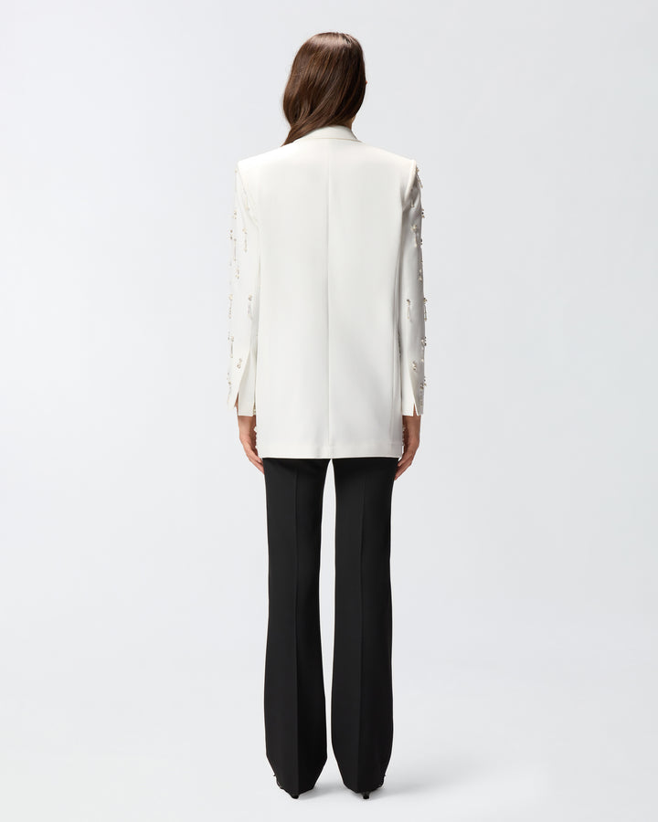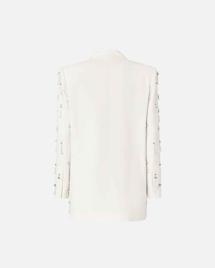 Straight-fit blazer with an invisible button, front pockets and a breast pocket, made from fine poly viscose fabric. The perfect fusion of elegance and craftsmanship, this style is embroidered with sparkling crystals and pearls on the front and sleeves: in addition to giving unparalleled sparkle, they add fluid, contemporary movement. The elegant fit and attention to detail make this blazer a unique piece, ideal for special evenings and high-class occasions.