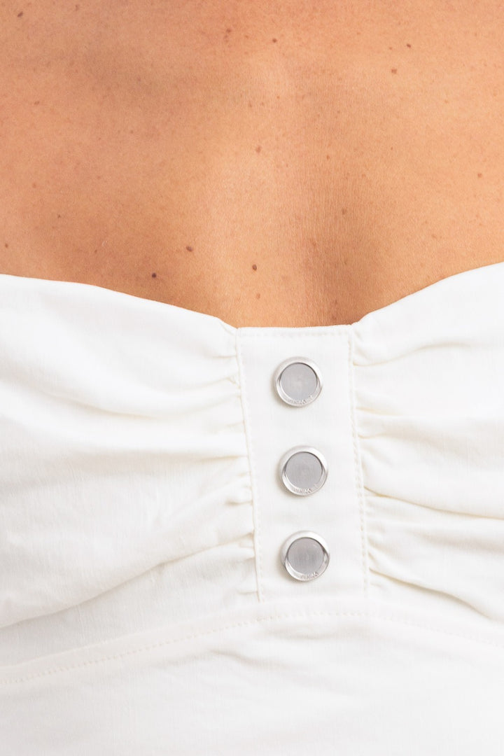 Women's sleeveless crop top made from lightweight stretch linen-blend fabric that's perfect for even the warmest days. This sleeveless top features spaghetti straps, a gathered sweetheart neckline at the front and a row of three metal buttons down the front. This top's cropped cut and feminine, summery design will give any look you choose to pair it with a fresh touch.