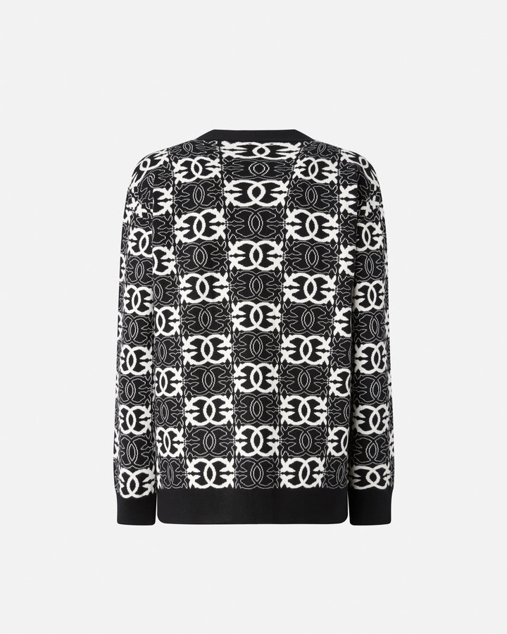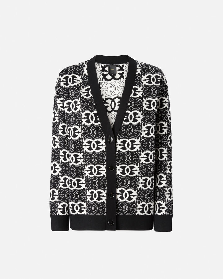 Oversized, long-sleeved knit cardigan with tone-on-tone buttons and contrasting ribbed V-neck, placket and cuffs. The all-over jacquard Love Birds logo motif is an eye-catching detail that enhances the model. The piece has undergone finishing tests to minimise the possible formation of pilling, ensuring greater fabric softness and durability. Pair this refined, versatile piece with its matching skirt from the same collection for a sure-fire look.