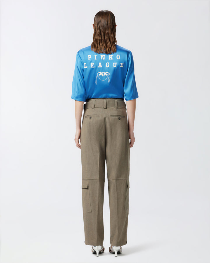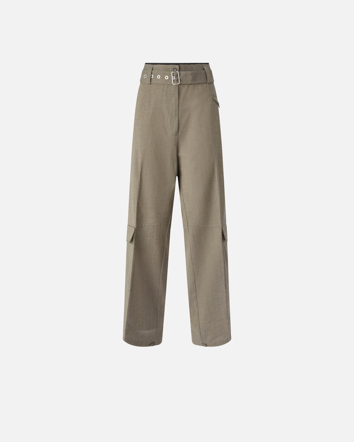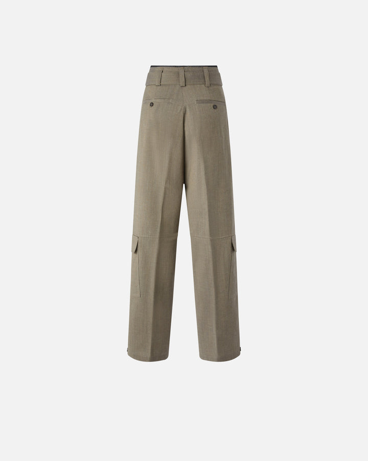 Tapered cargo trousers in yarn-dyed wool-blend fabric, complete with matching-fabric belt with square metal buckle. The trousers are enhanced by flap pockets at the sides and a small pocket with buttoned triangular flap on one side. Paired with the matching blazer, these trousers create a coordinated suit with a workwear edge: an original office outfit you can team with a bejewelled shirt and pointed-toe heeled shoes for a feminine touch.
