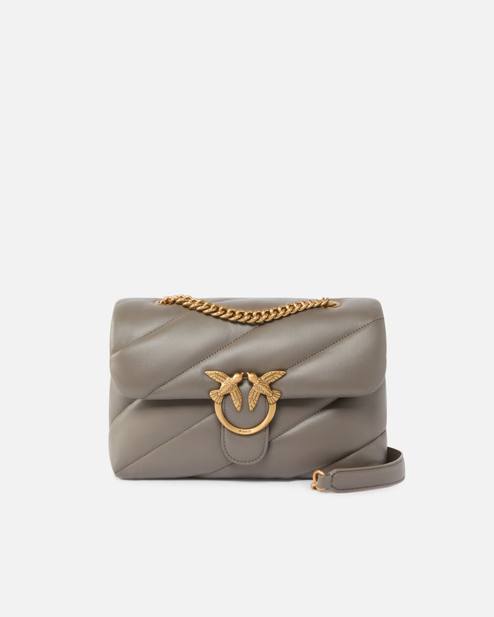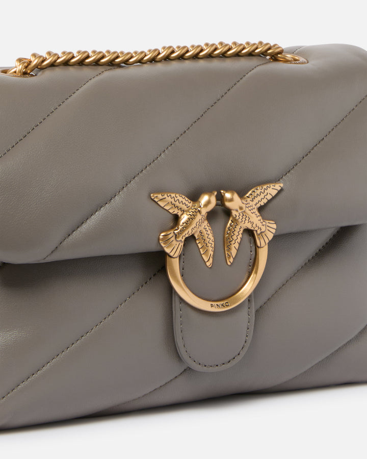 Classic Love Bag Puff in soft nappa leather featuring maxi slanted quilting. The fastening is embellished with the iconic metal Love Birds Diamond Cut buckle. The accessory boasts a microsuede-lined interior, complete with a zipped centre divider pocket and slip pocket. The shoulder strap combines the classic round metal chain with a practical nappa leather shoulder pad.