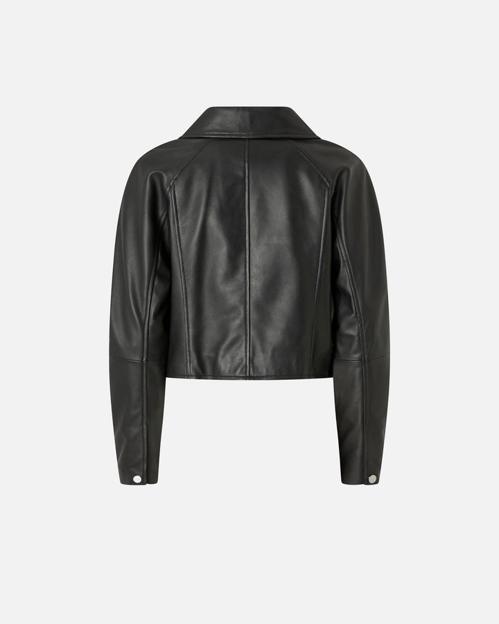 Biker-style jacket in soft, smooth nappa leather with metal buttons at the neck. Off-centre zip fastening. This jacket offers a fresh, modern take on the classic leather biker jacket, with a slightly more relaxed and rounded cropped cut, making it ideal to pair with everyday looks and elevate them with the style this piece of outerwear brings.