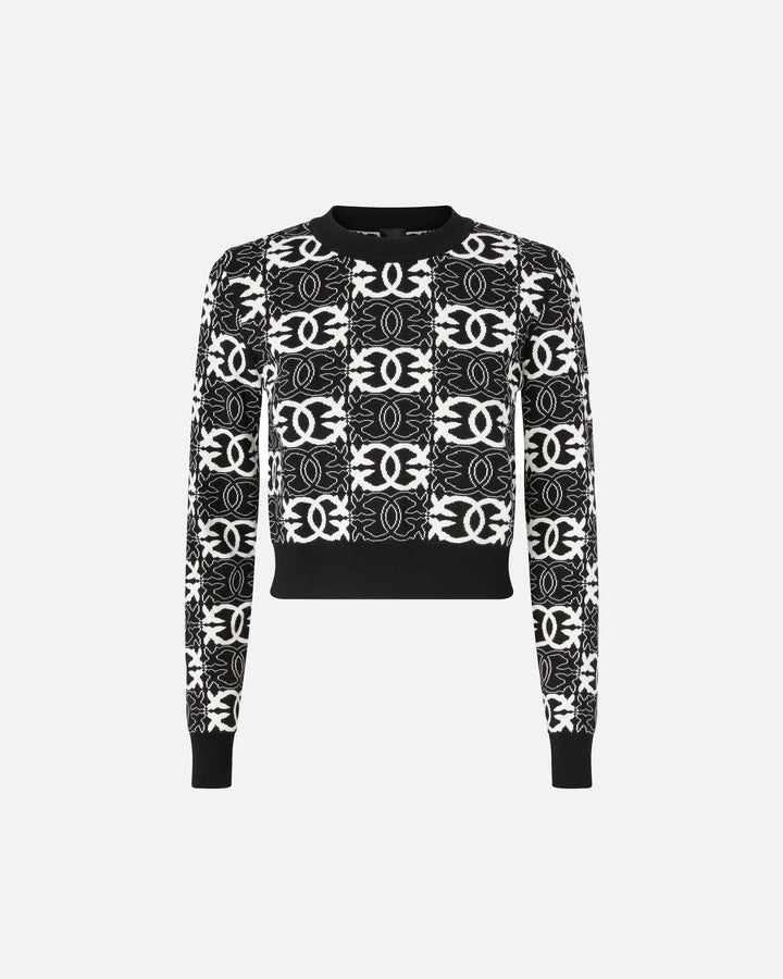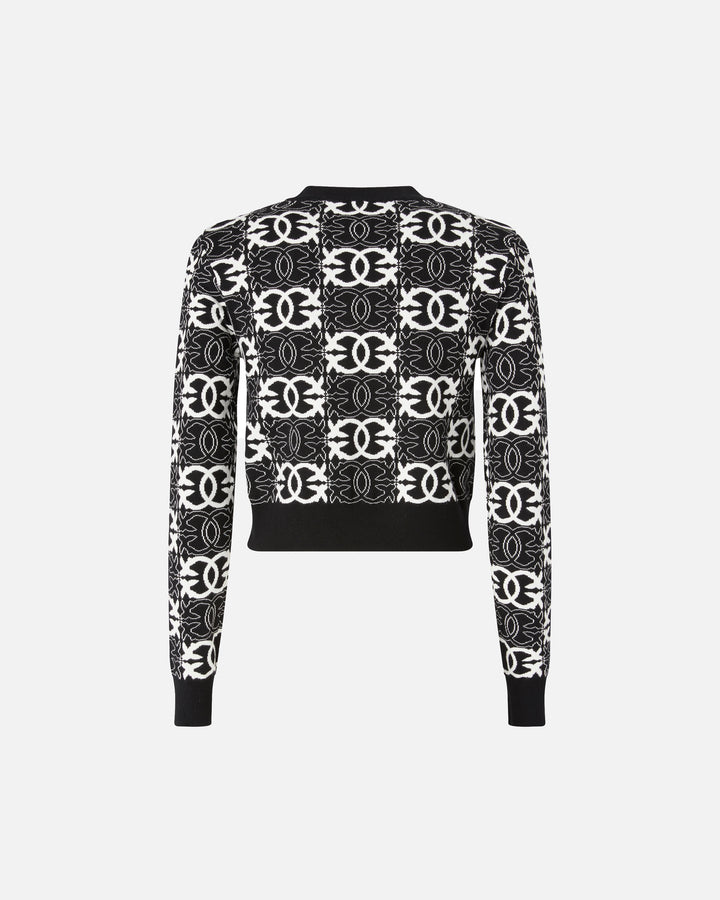 Warm, soft cropped sweater with long sleeves and contrasting ribbed neckline, placket and cuffs. The all-over jacquard Love Birds logo motif is an eye-catching detail that enhances the model. Pair this versatile accessory with a pair of jeans for a casual outfit that leaves nothing to chance. The piece has undergone finishing tests to minimise the possible formation of pilling, ensuring greater fabric softness and durability.