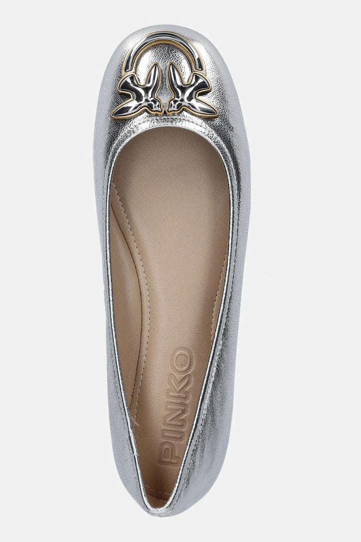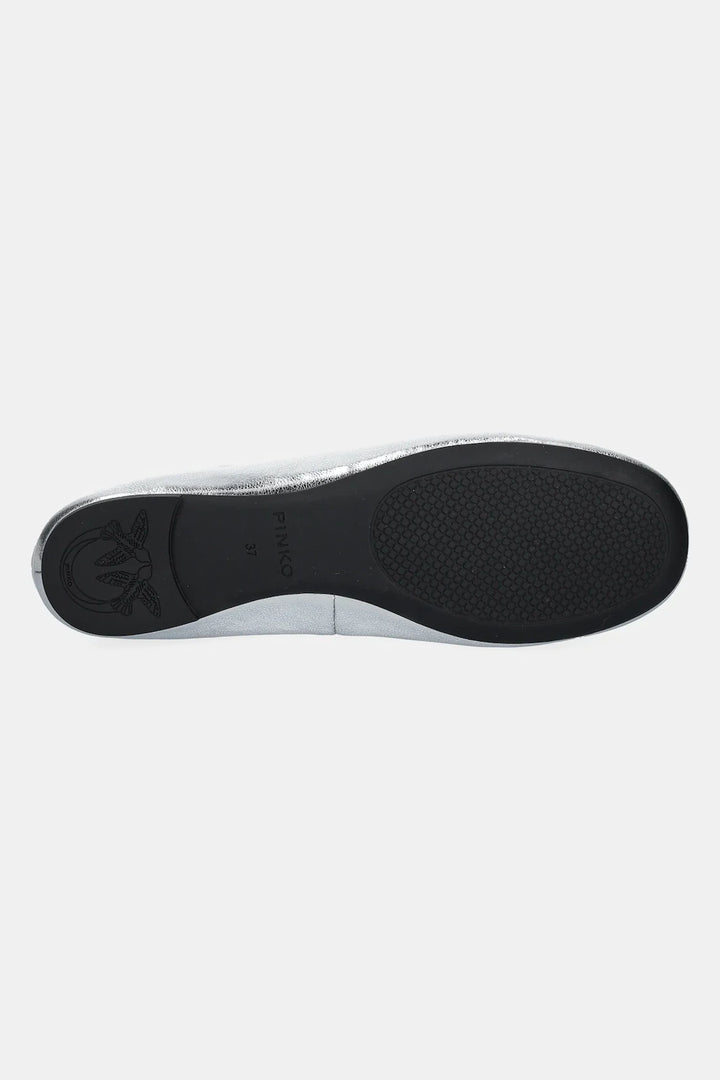 The Pinko Gioia ballerina is crafted from premium leather and features a striking metallic silver finish, creating a modern and glamorous look. The elegant, minimalist design with a round toe emphasizes a feminine silhouette. A large, gold logo flower at the front adds a luxurious touch. The clean lines and sleek silhouette make this ballerina versatile, suitable for both casual and formal occasions. The glossy finish catches the light attractively and adds a statement to any women's shoe collection.