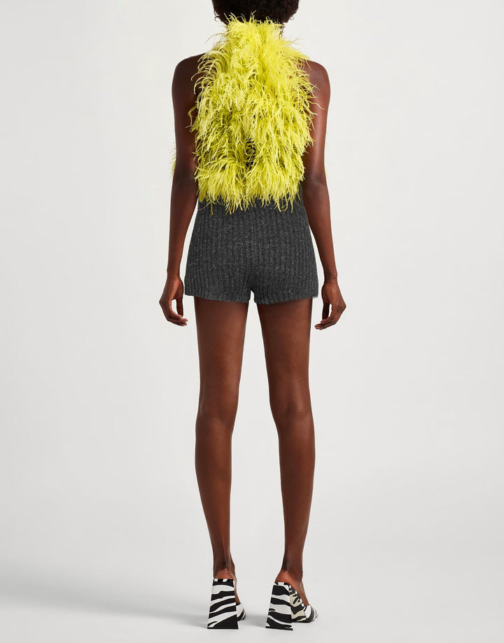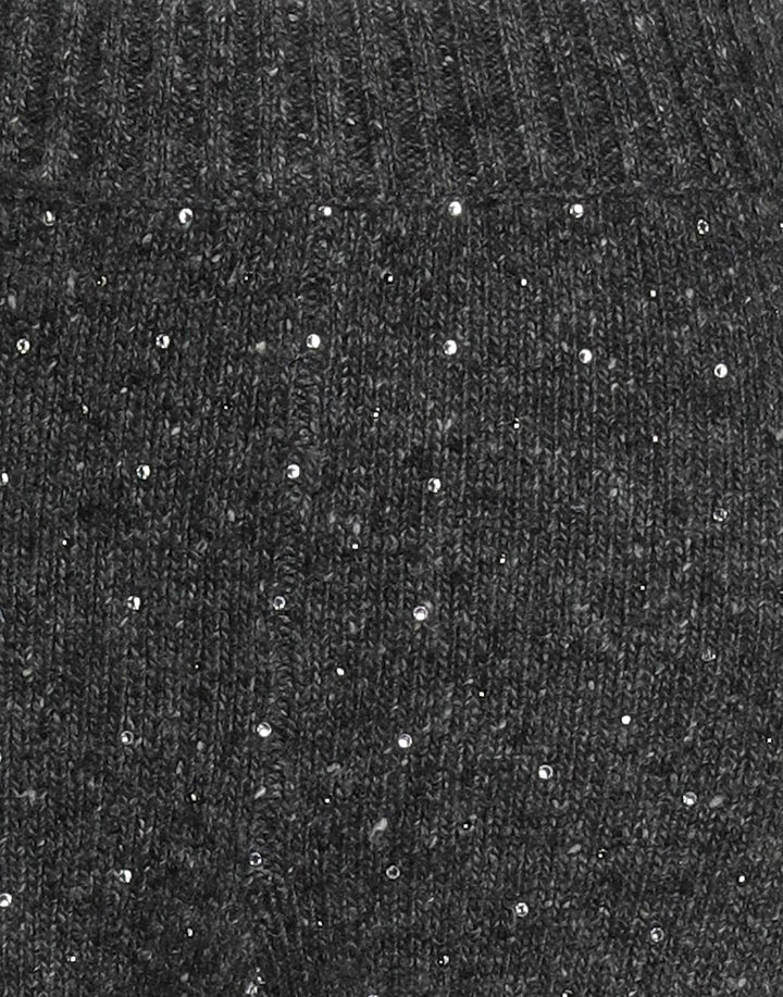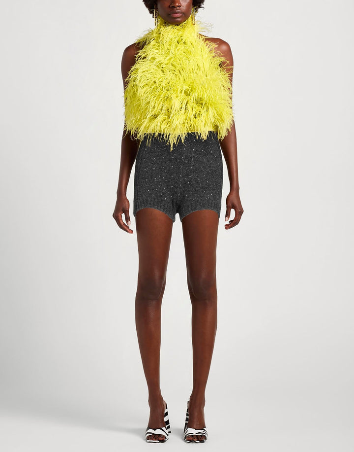 High-waisted culotte-style shorts with a slim fit, made from knit fabric that is very soft to the touch. The soft bouclé fabric is dotted with rhinestones that embellish the design. The waist and trims are ribbed, while the final touch is given by the tone-on-tone label with PINKO lettering logo on the back of the design. The piece has undergone finishing tests to minimise the possible formation of pilling, ensuring greater fabric softness and durability. Wear the piece together with the matching cardigan, for a comfortable and chic look.