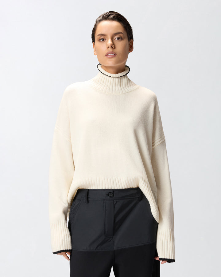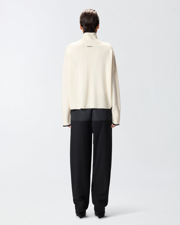 Long-sleeved polo-neck in a merino wool and cashmere blend, ideal for warming up your cold-season outfits. Understated and contemporary, this design will become the undisputed star of all your outfits, whatever the occasion. The contrasting yarn on the neckline and cuffs adds a touch of vibrancy to the design. The neck, hem and cuffs are ribbed, while the final touch is given by the PINKO lettering logo on the back. The piece has undergone finishing tests to minimise the possible formation of pilling, ensuring greater fabric softness and durability.
