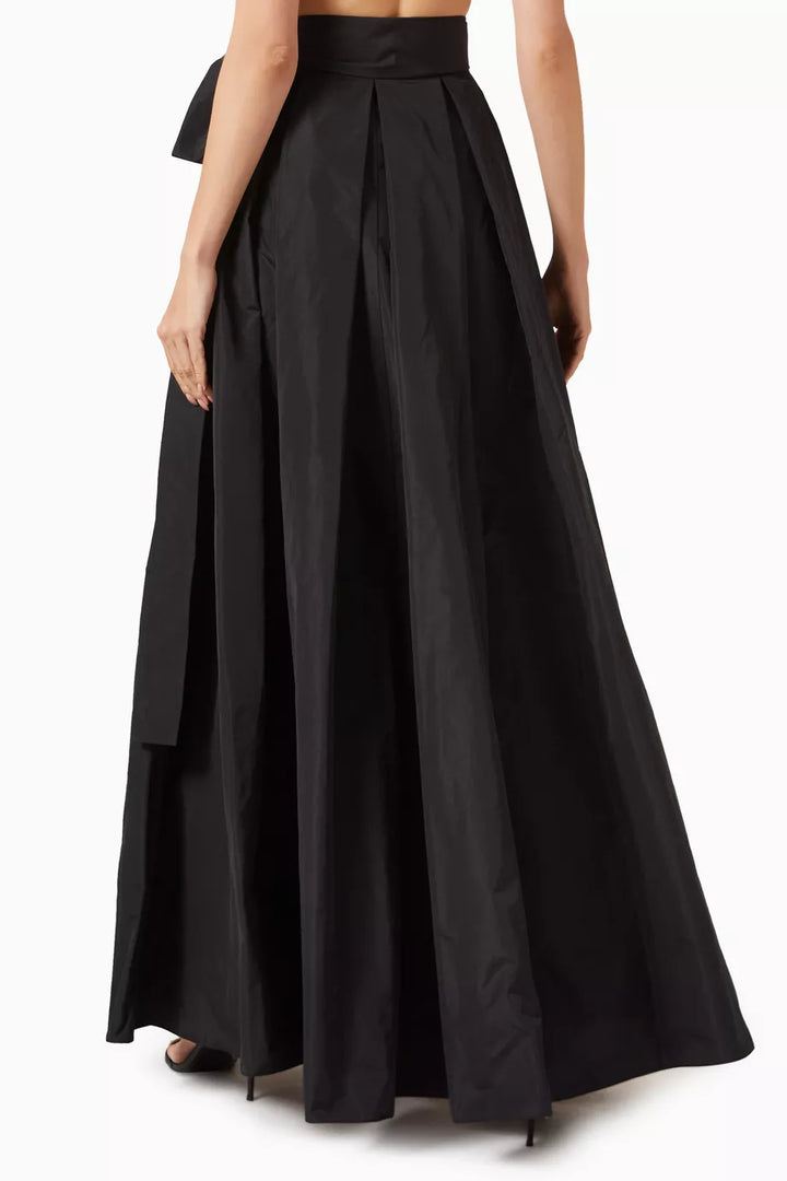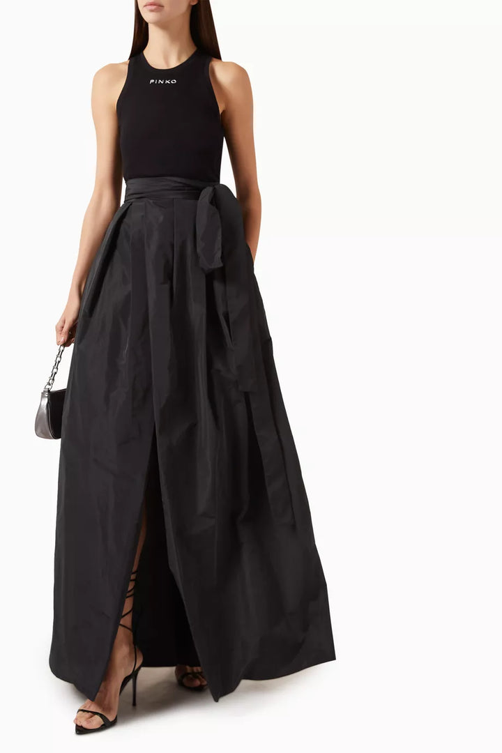 Long, full taffeta skirt with a belt that ties on the high waist. The material is light and shiny and blends perfectly with the dynamic volume that distinguishes the garment. Wear this style for a fluid, slinky effect that elegantly enhances the lines with sophistication and the feminine silhouette, making it particularly elegant for ceremonies and special occasions.