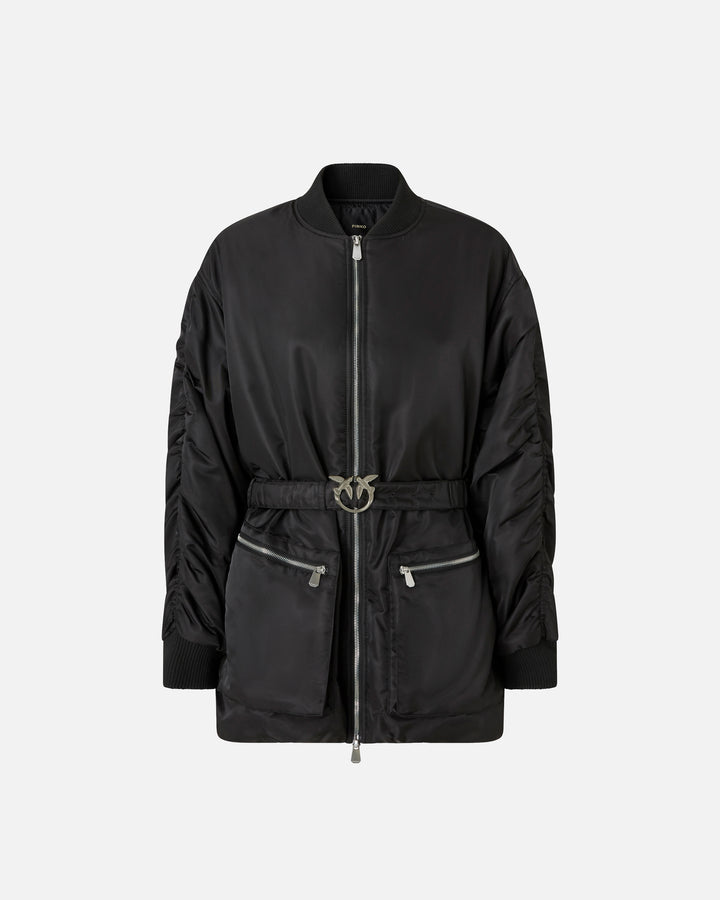 Technical satin jacket with long dropped-shoulder sleeves and utility-style maxi-pockets with zip on the front. The model features typical bomber details, such as the classic rib-knit collar and cuffs, but also flaunts more original accents, such as the elongated silhouette and gathered sleeves. Detachable waist belt embellished with the iconic Love Birds Diamond Cut buckle. Two-way zip fastening on the front. For extra comfort when worn, this bomber jacket is lined with contrasting fabric.