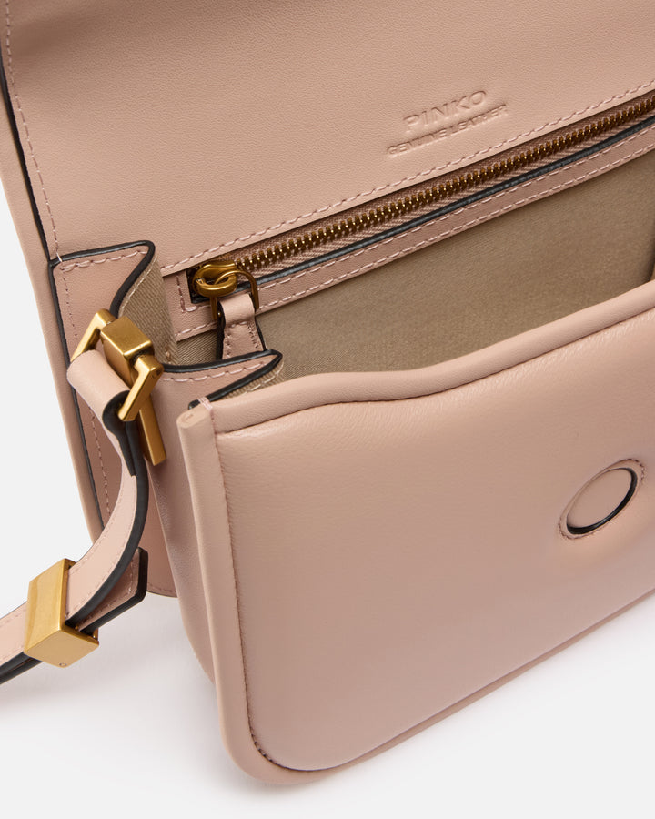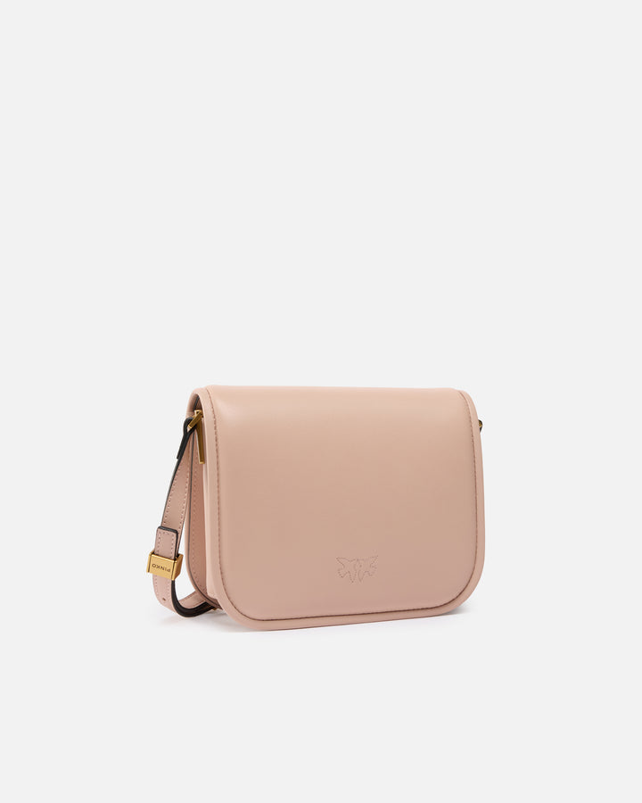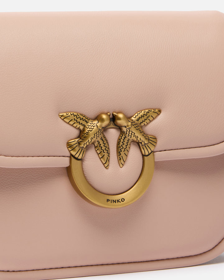 Small shoulder bag characterized by a square Love Bag Box shape made of lightly quilted nappa, which gives the rigid structure a more rounded line. The closure of the bag is completed by a golden metal buckle with Love Birds Diamond Cut bird logo on the flap. The inside of the mini bag is lined in cotton drill fabric and includes a practical wall pocket closed with zip. The fixed leather shoulder strap is adjustable to customize the carrying on the shoulder or by hand. Activate your PINKO bag: check the authenticity of your product and access the personalized experience by bringing your smartphone close to the Love Birds embroidery on the back of the bag!