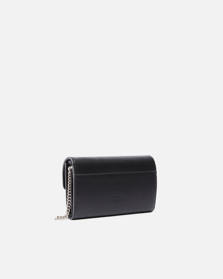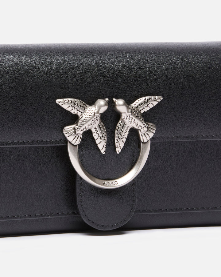 Love Bag Wallet with shoulder strap in soft, silky leather. The concealed-button fastening is embellished by the iconic Love Birds Diamond Cut buckle. The polycotton-lined interior is divided into four compartments, one of which is zipped and two of which have card slots. The removable, round-link metal-chain shoulder strap allows you to wear the purse like a crossbody bag.