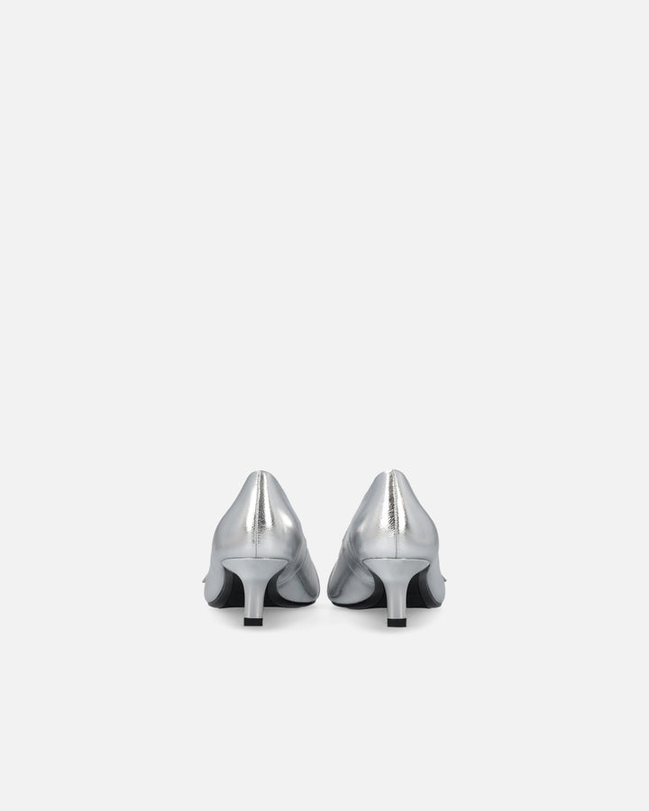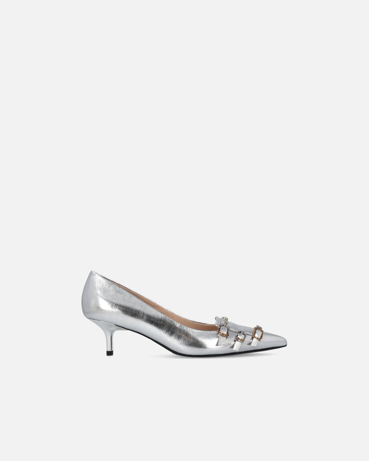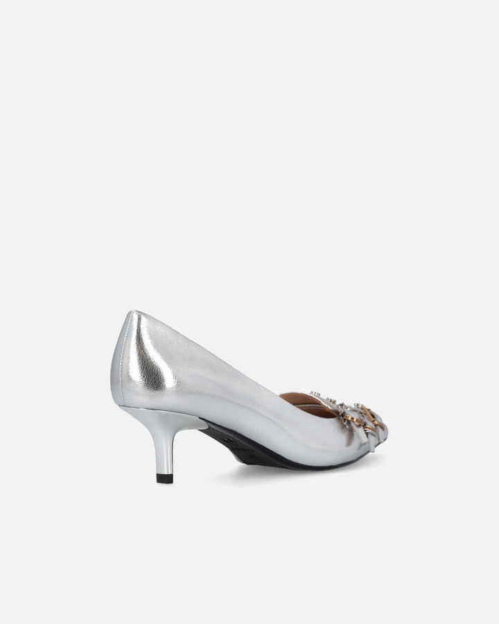 Pointed-toe pumps in soft, laminated nappa leather with slender 5 cm-high heel. This shoe stands out for its three front straps embellished with gold- and silver-coloured metal loops, round studs and a small Love Birds logo plaque. The perfect pair for PINKO women who refuse to compromise on style.