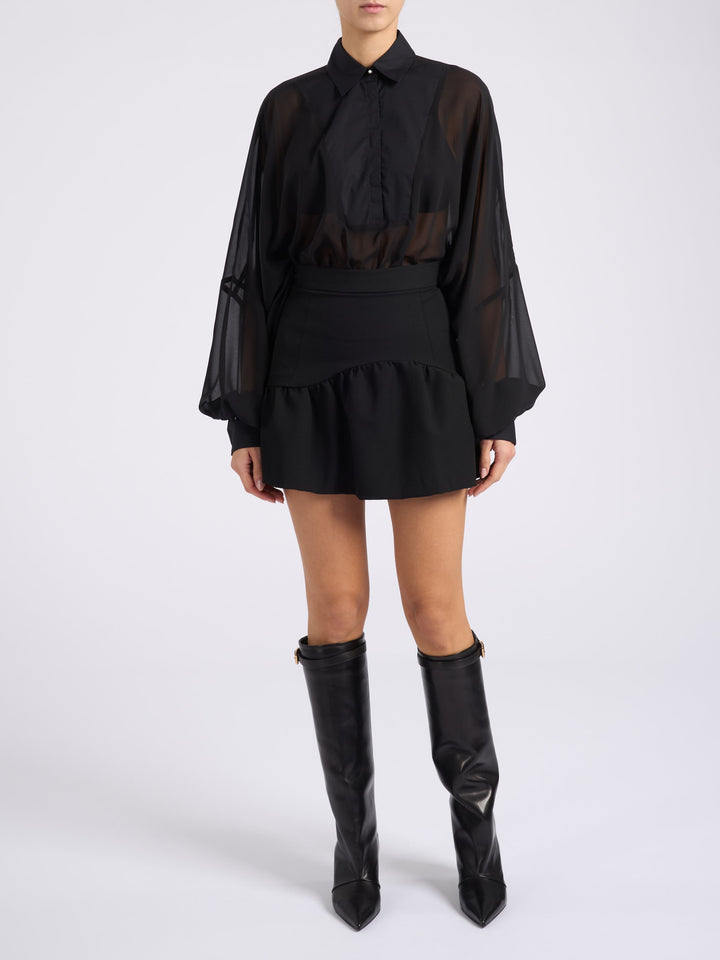 Mini skirt with rear zip and slightly asymmetric flounce at the bottom that, with its delicate, voluminous design, gives the garment a feminine style. This piece is made from poly-viscose crepe, a double-layered fabric that's particularly versatile and high-performance thanks to its two-way-stretch construction and has undergone high-quality treatments that give it a sophisticated woolly appearance.