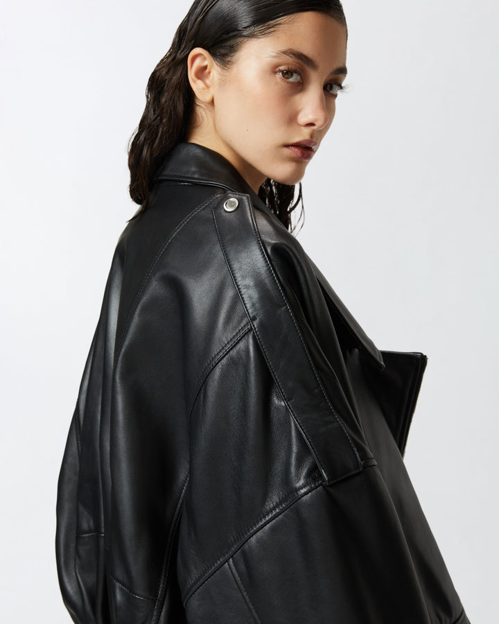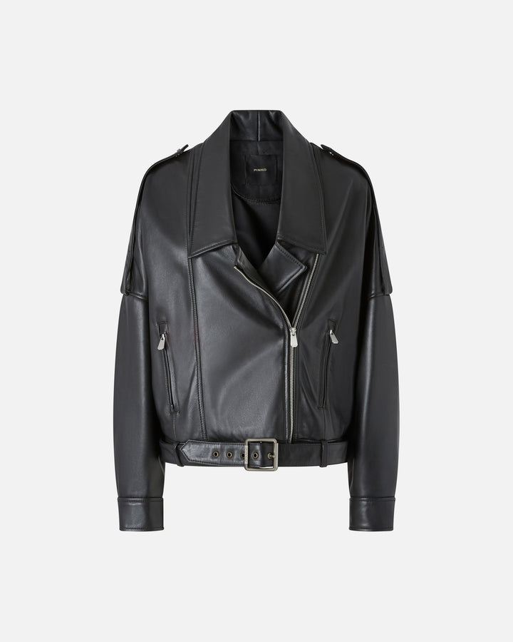 Biker jacket in fine nappa leather with relaxed, slightly oversized fit. The low set-in long sleeves feature a buttoned epaulette on the shoulder, while the vertical side pockets are fastened with a metal zip. This nappa leather jacket is complete with vertical topstitching at the front and back, an elastic band at the bottom at the back and a matching belt with a square buckle that provides a distinctive finishing touch. This outerwear garment is lined with fabric, making it a key piece for transitional outfits. Asymmetric metal zip fastening on the front. This outerwear jacket offers a fresh, modern take on the classic leather biker jacket, with a slightly more relaxed and less structured fit, making it ideal to pair with everyday looks and elevate them with style.