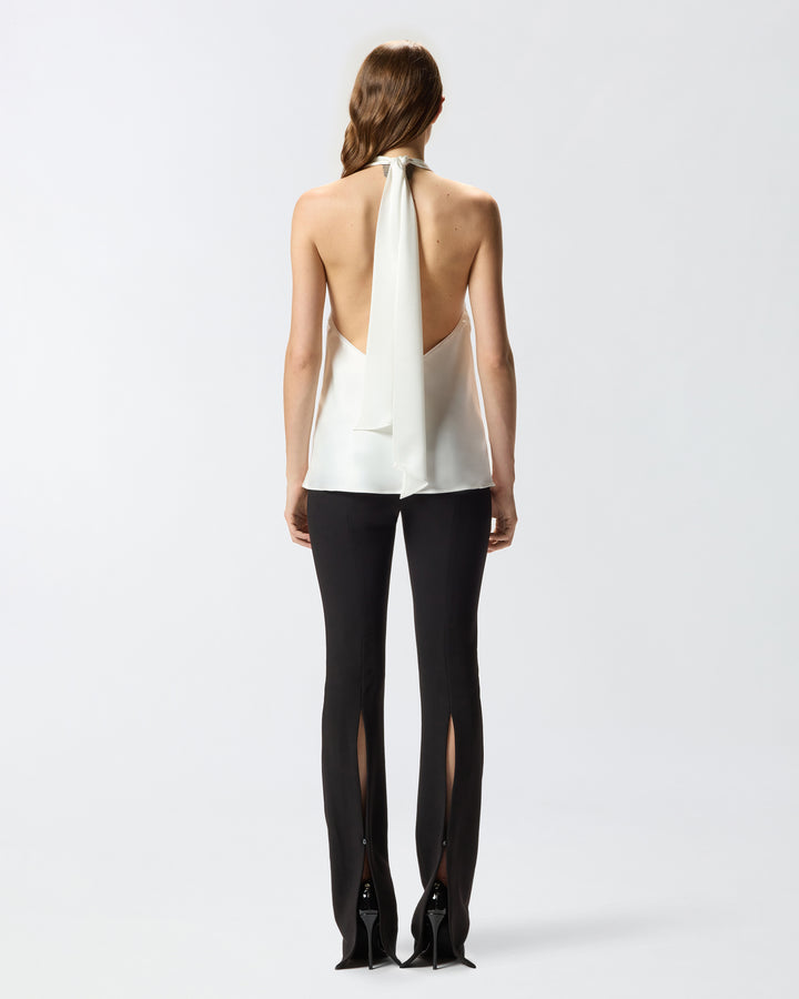 Loose-fit sleeveless top with a halterneck embellished with metal spheres. A touch of sensuality is provided by the bared back, which is caressed by the sash tie on the neck that falls free, creating movement. The shiny satin gives the piece unique shimmer and a particularly soft hand. Wear this top for a fluid, slinky effect that elegantly enhances the lines with sophistication and the feminine silhouette.