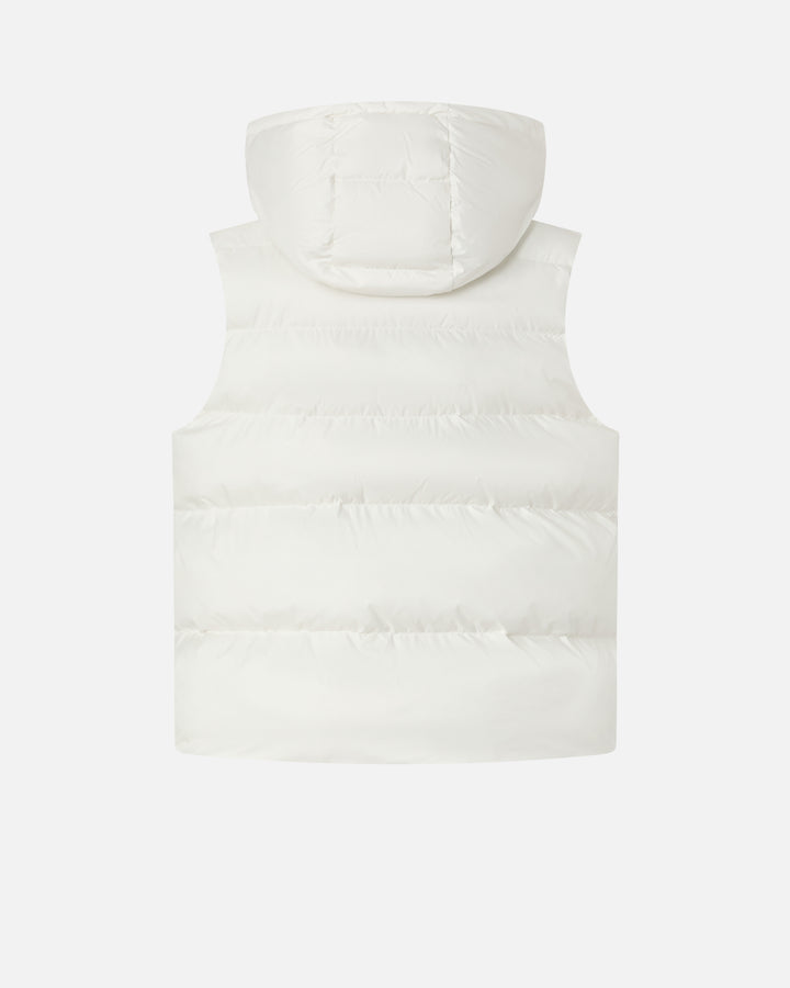Padded technical fabric gilet with special matt finish. The style features a wide, cosy hood and comfortable welt pockets. Two-way zip fastening on the front. This transeasonal outerwear piece offers the perfect combination of functionality and style, protecting you on days with uncertain weather.