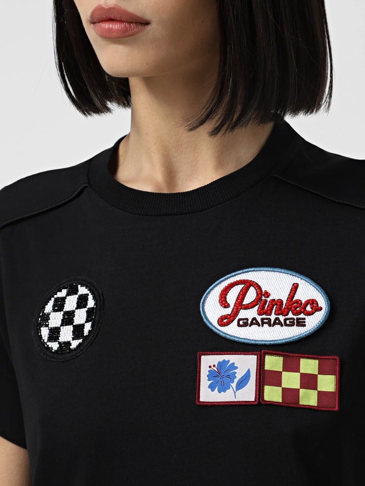 Short-sleeved, straight-cut cotton jersey top with contrasting piping and PINKO Garage-themed patches that evoke the world of racing and motorsport. Complete with short sleeves with cuff, this slim-fitting T-shirt is perfect to pair with your favourite jeans for a daytime outfit with an extra originality.