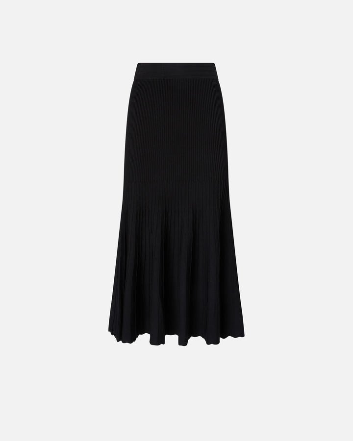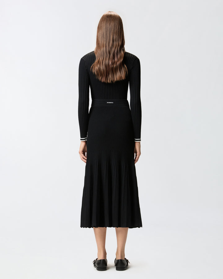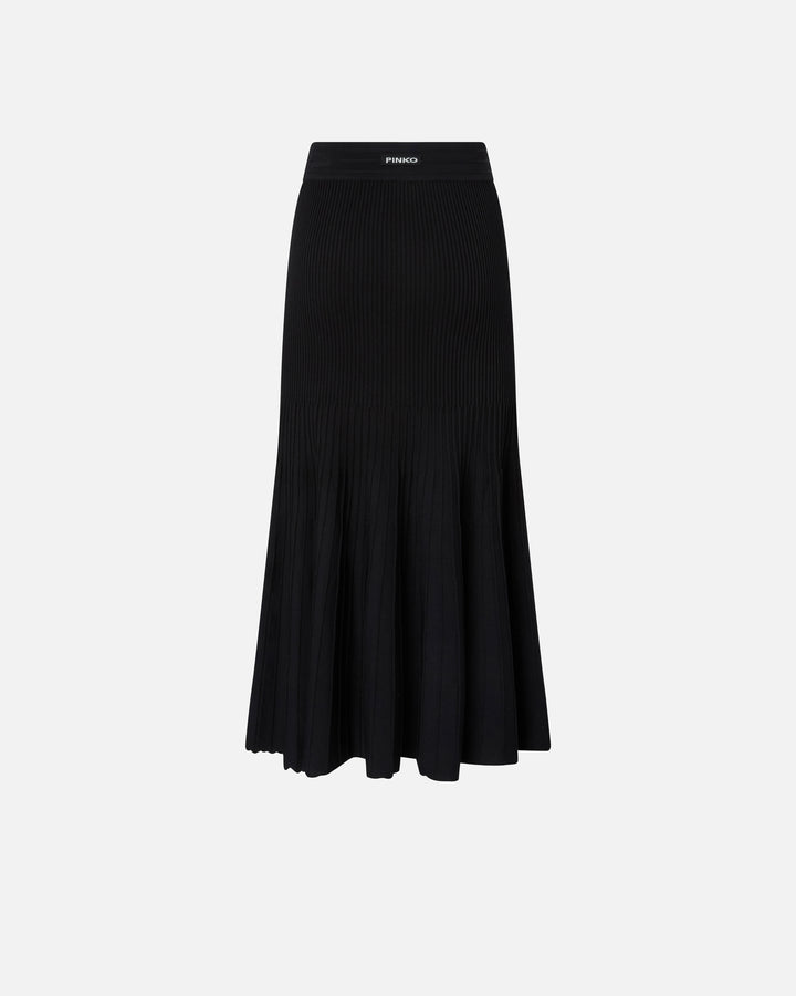 Pleated midi skirt made from a refined viscose-blend knit and featuring an elasticated waist. The design boasts a slim line along the sides that flares out towards the hem. In addition, the rib knit creates dynamic movement with every step. The final touch is given by the tone-on-tone label with PINKO lettering logo on the back. The piece has undergone finishing tests to minimise the possible formation of pilling, ensuring greater fabric softness and durability.
