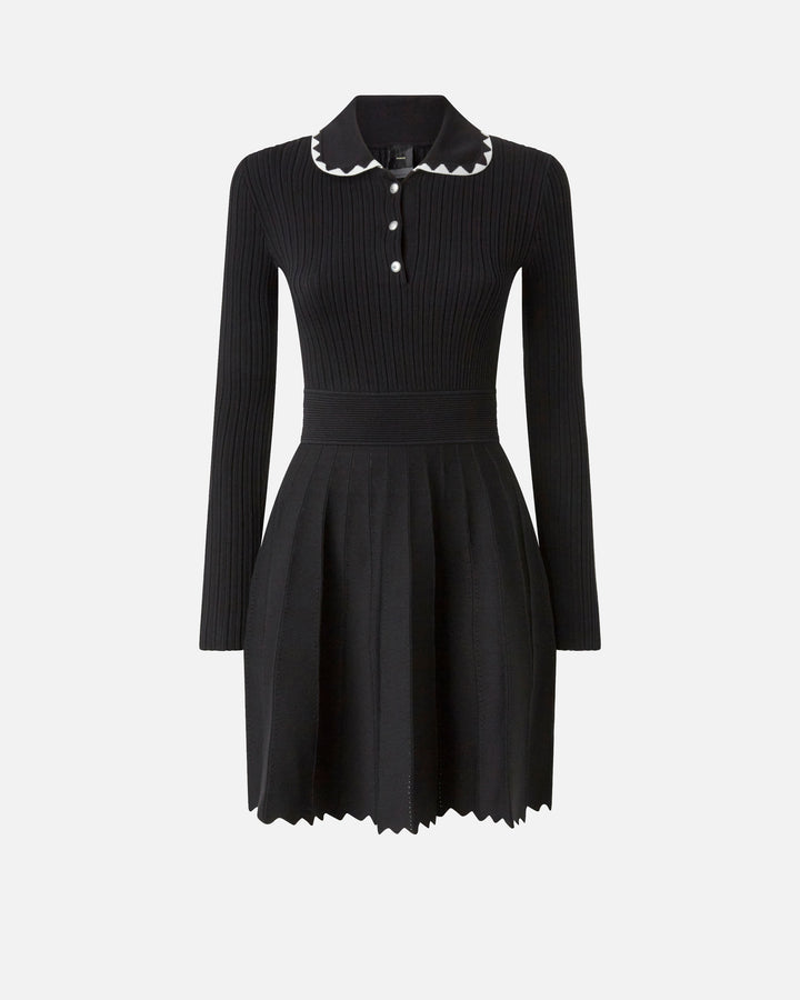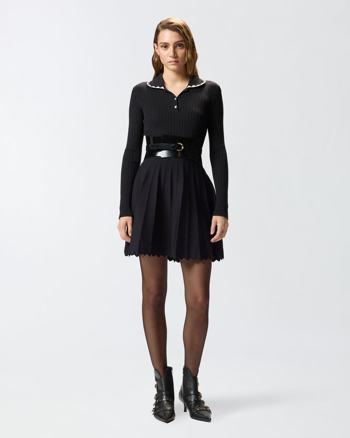 Long-sleeved viscose-blend dress with a contrasting polo collar and three-button fastening. The piece features an embroidered waistband and is completed by a wide, pleated skirt, embellished by a scalloped hem. The final touch is given by the tone-on-tone label with PINKO lettering logo behind the neck. The piece has undergone finishing tests to minimise the possible formation of pilling, ensuring greater fabric softness and durability. The perfect dress for elegant style that does not compromise on comfort.