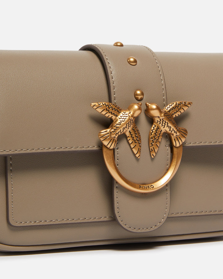 Pocket Love Bag One in soft, silky leather. The micro-studded leather strap fastening is complete with a Love Birds Diamond Cut buckle. This accessory is lined with technical fabric, and has an inner zipped pocket and card slots. Removable thin metal round-chain shoulder strap.