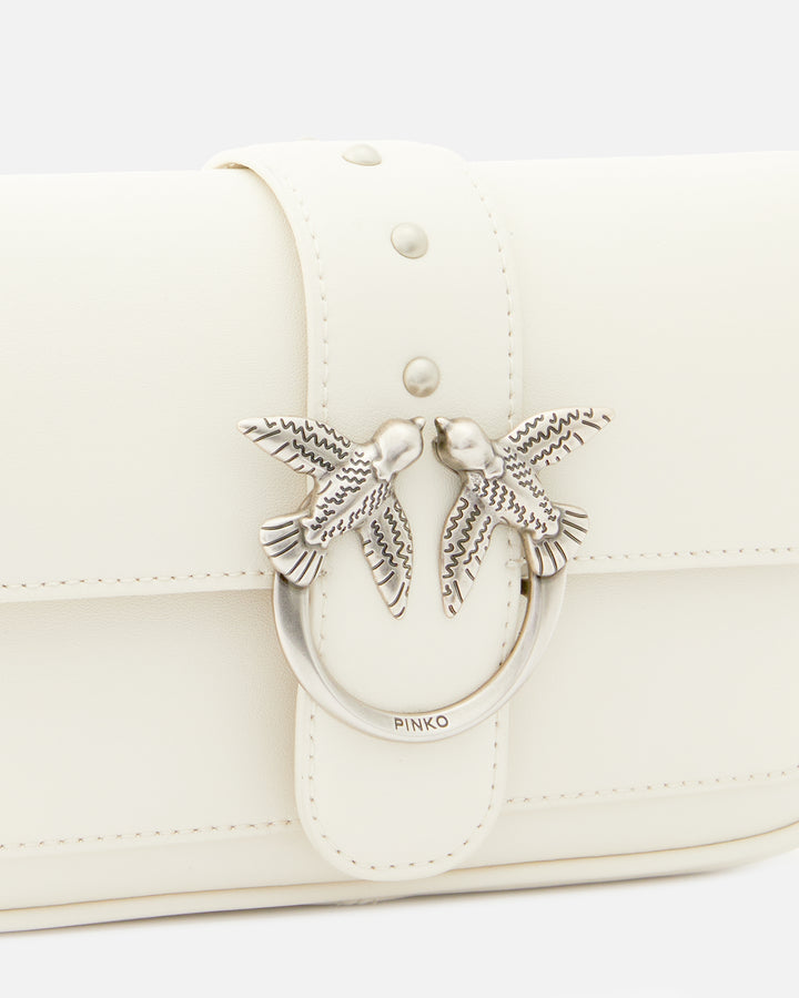 Pocket Love Bag One in soft, silky leather. The micro-studded leather strap fastening is complete with a Love Birds Diamond Cut buckle. This accessory is lined with technical fabric, and has an inner zipped pocket and card slots. Removable thin metal round-chain shoulder strap.