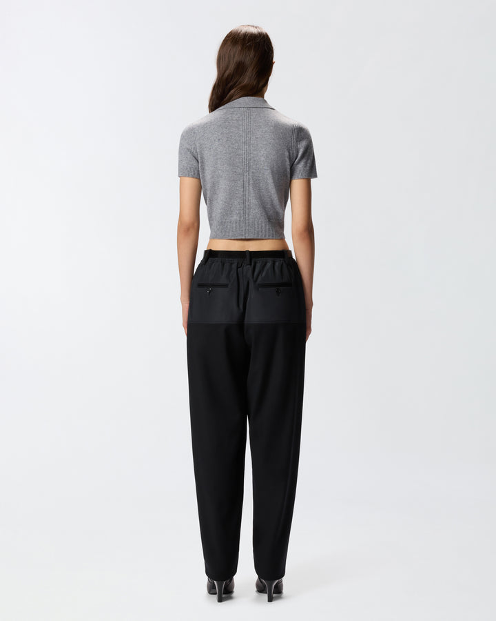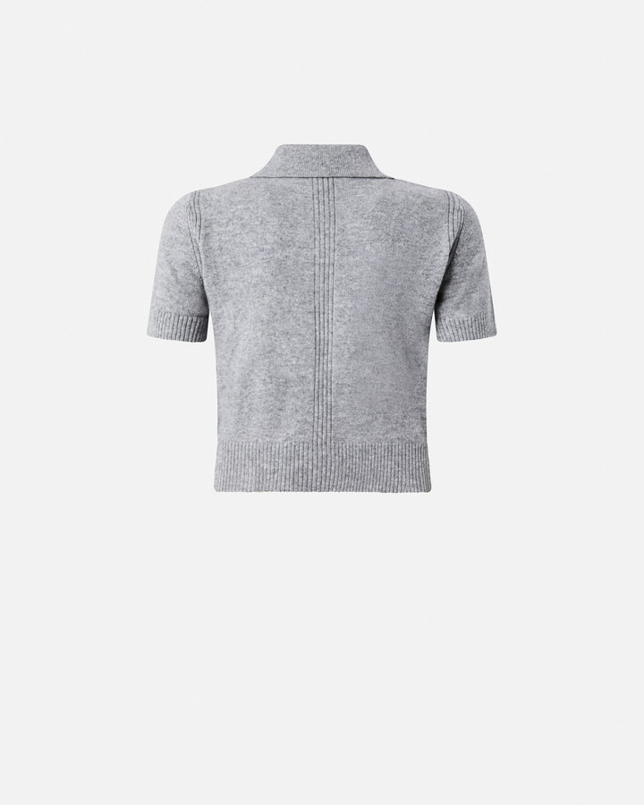 Short slim-fit polo-style sweater in soft merino wool and cashmere-blend yarn. The style is completed by the ribbed sleeve trims and hem, and the tone-on-tone label with the PINKO lettering logo on the left side of the chest. The contrasting yarn elegantly highlights the three-button placket. The piece has undergone finishing tests to minimise the possible formation of pilling, ensuring greater fabric softness and durability. The quality fabric and versatile design will create endless looks.