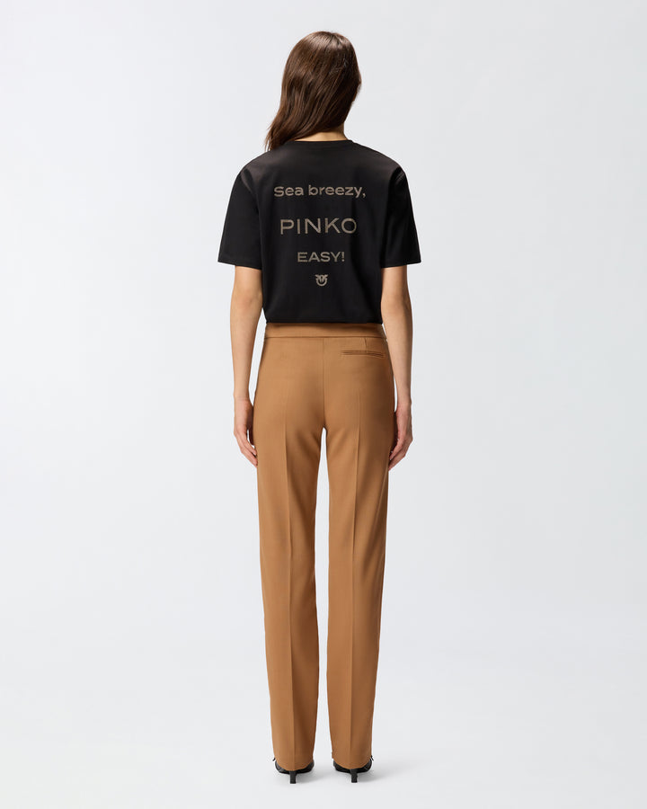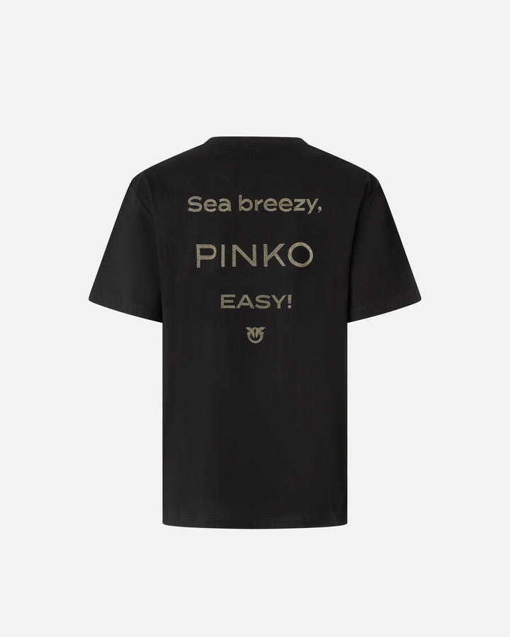 Pure cotton jersey T-shirt with round neck and short sleeves. The piece features shiny rhinestones that cover both the PINKO lettering logo on the front and the lettering on the back with the slogan "See breezy, PINKO easy" and our must-have Love Birds logo. This T-shirt will work seamlessly with your favourite trousers, elevating your look in a simple, elegant and original way.