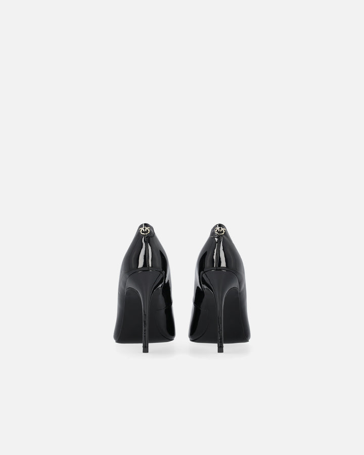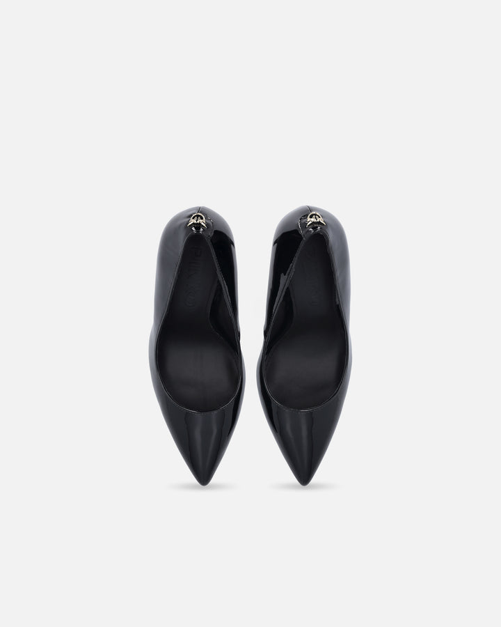 Pumps in patent leather-effect fabric with tapered toe and custom mini Love Birds logo plaque on the heel. Sole made from tunit, a synthetic material with properties similar to leather, 10.5 cm stiletto heel, and leather lining and insole.