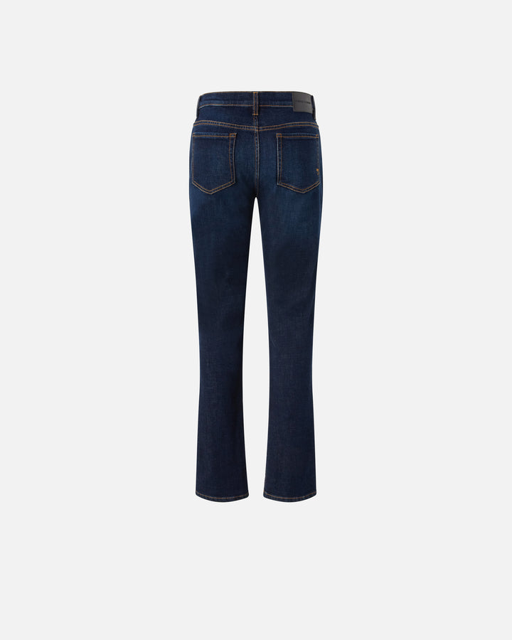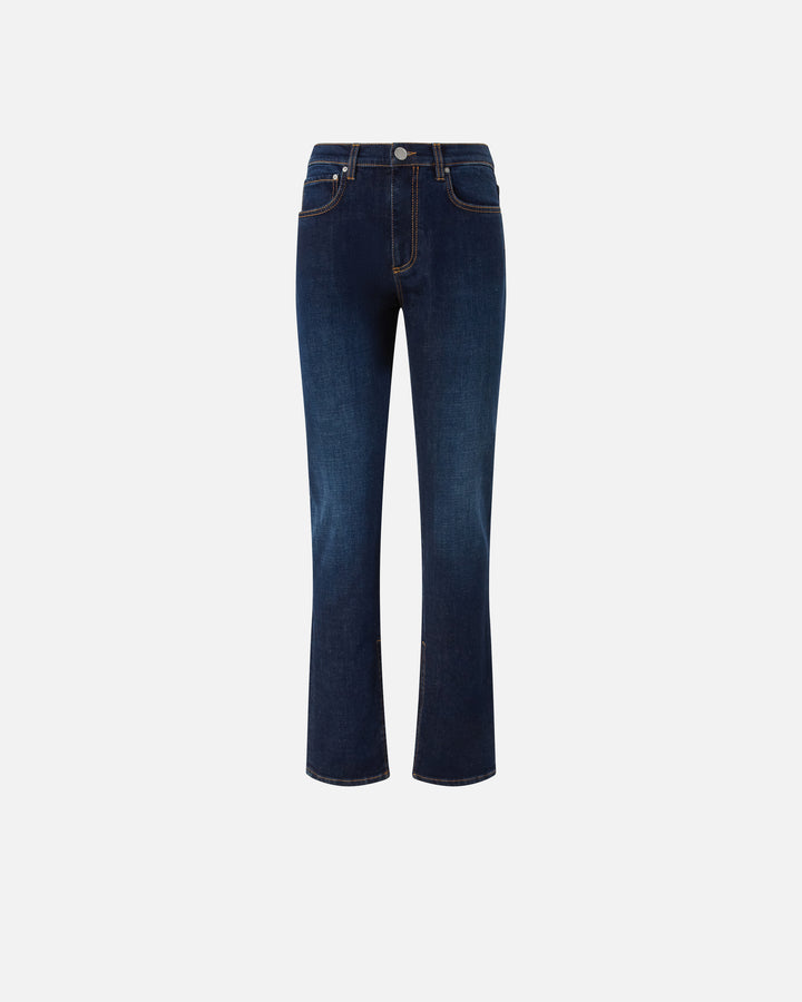Women's straight-leg jeans in dark rinse-wash cotton denim that you can personalise in all kinds of ways. Over time, the colour of the denim fades naturally, adapting to all types of look. This five-pocket pair gives the classic straight-leg fit a feminine twist: the slit at the bottom of the legs, on the inside, reveals the shoes or boots you decide to pair with the jeans and creates a super-trendy slightly flared effect. Metal zip and tack-button fastening.