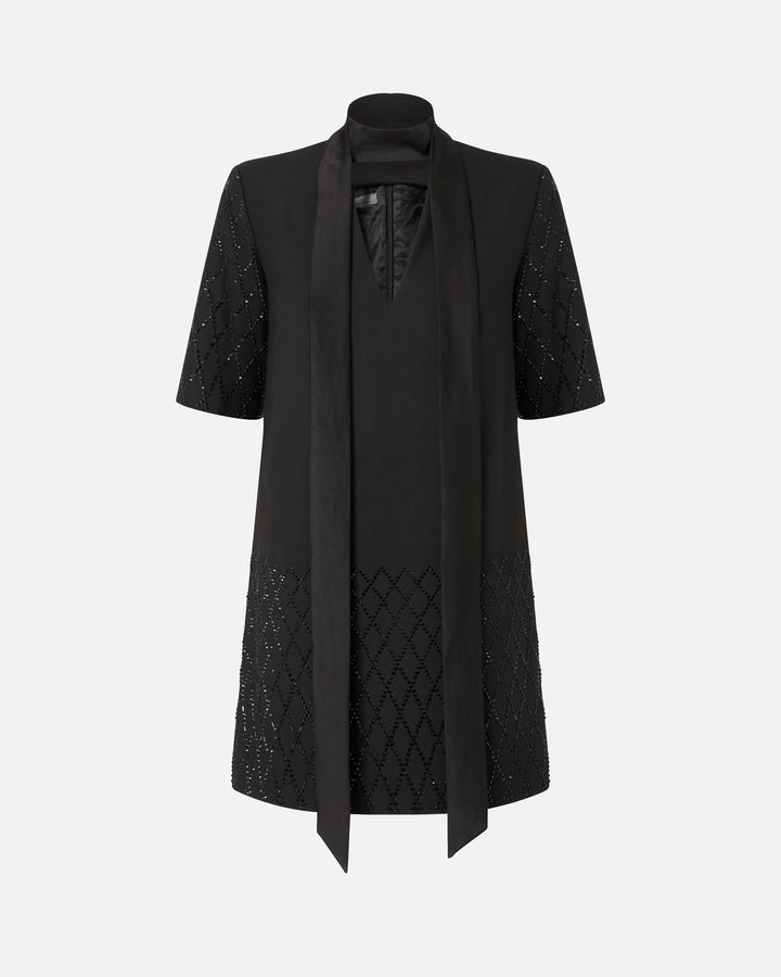 Loose-fitting, short-sleeved T-shirt-style dress with zip on the back. This dress features rhinestone appliqué in different shapes and sizes that creates a sophisticated geometric design on the hem and sleeves. The detailing gives the garment a fine, luminous effect that elevates the understated quality of the silhouette. The satin scarf accessory completes the look impeccably.