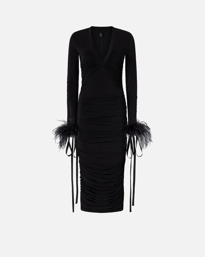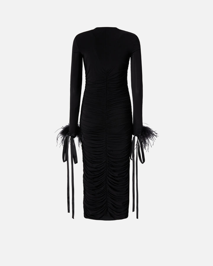 Elegant knee-length dress in light jersey featuring a slim fit and a deep V-neck. The lightness of the material allows you to create draping and gathering for an extremely feminine and refined silhouette. The focus of the piece is certainly on the wrists that are embellished with real detachable ostrich feathers with grosgrain ribbon, which in addition to adding a touch of style, also become a real gem to wear around the neck. This garment is destined to become the ace up your sleeve when the dress code is of a high standard.