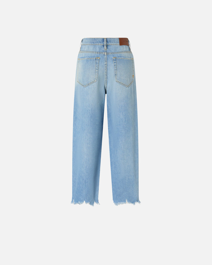 Women's five-pocket egg-fit jeans in soft-touch cotton and lyocell denim with a light wash that gives the garment a radiant modern shade. The rounded, wide-leg fit of these jeans is accompanied by irregular fringed hems at the bottom and rips created for a worn-effect look. Regular waist with slightly dropped crotch and metal zip and tack-button fastening. The fit of these balloon jeans is extremely on-trend this season and is the star of any super-cool everyday look.