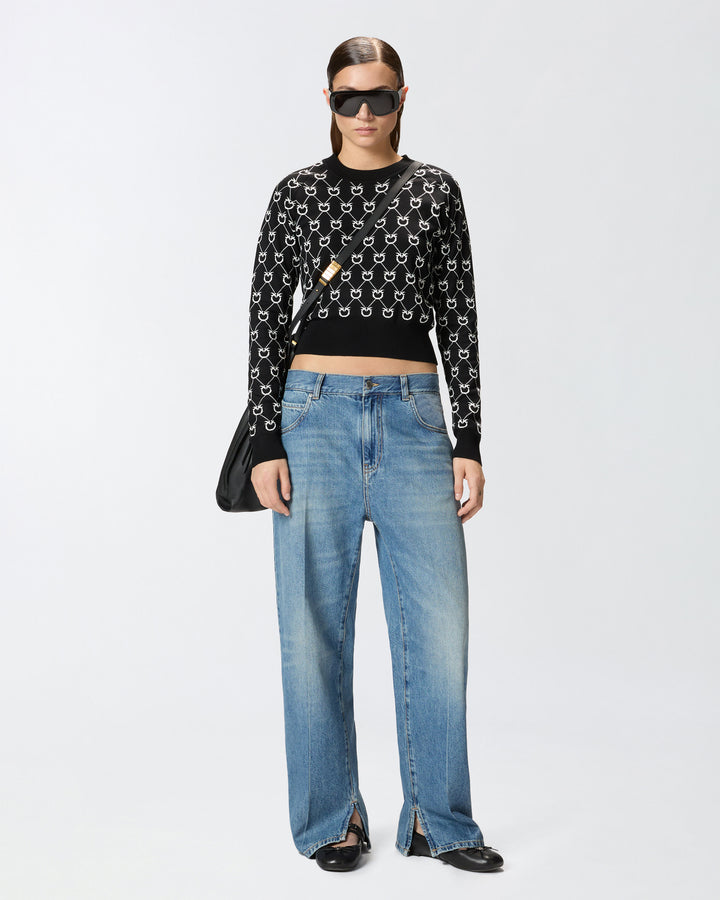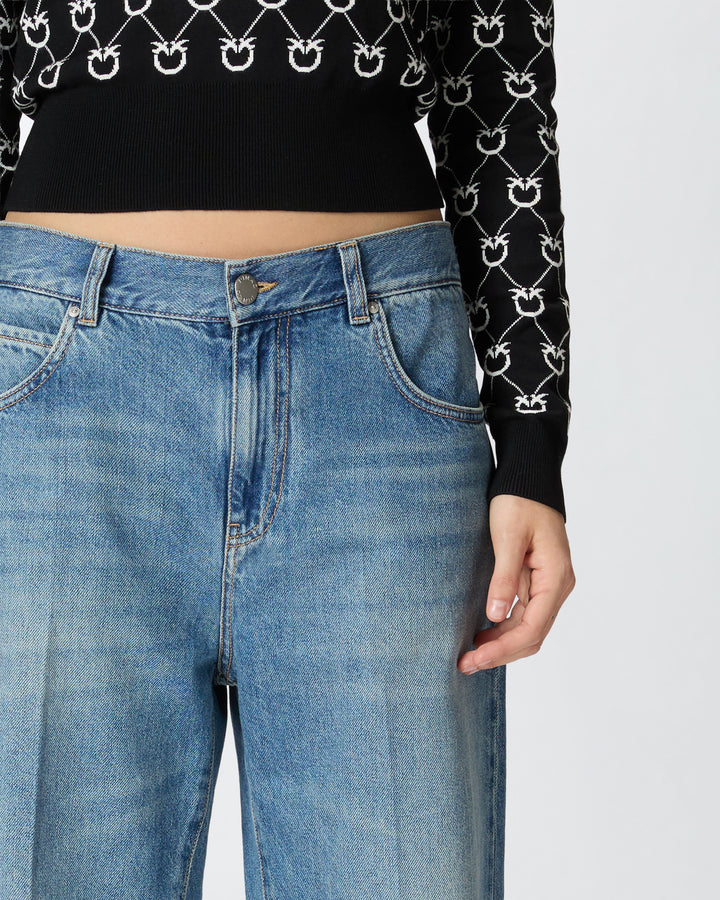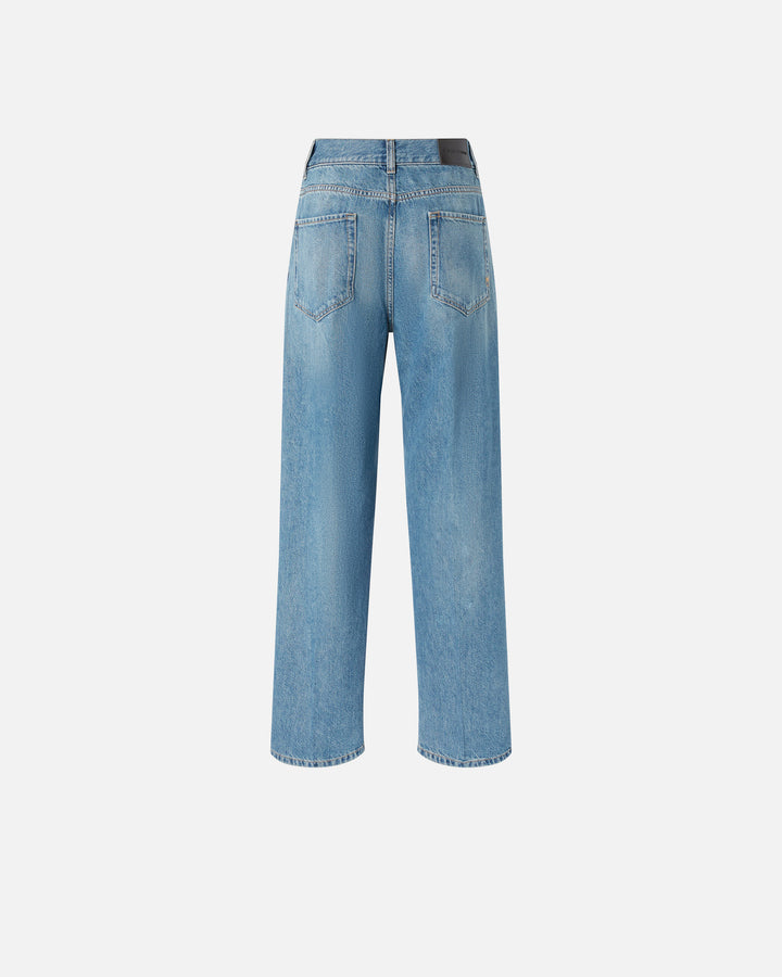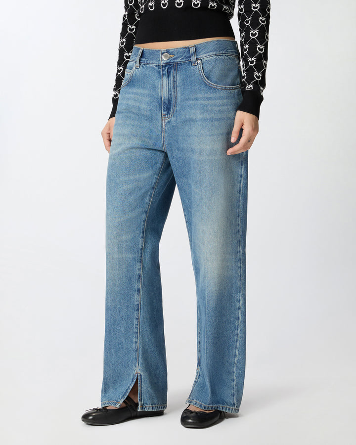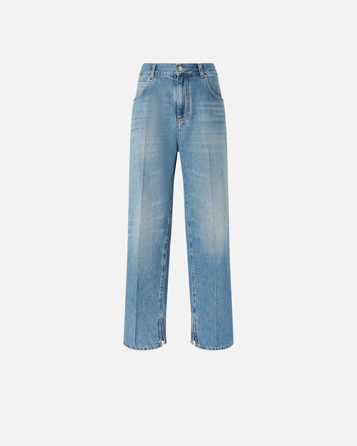 Women's five-pocket jeans in wild ocean-wash cotton denim with a vintage medium shade. These jeans feature slightly wide straight-cut legs with a central crease and a small side slit at the bottom, giving them a tailoring-inspired touch. The waist with relaxed crotch adds to the relaxed fit, giving the garment a casual yet refined feel ideal for both the office and your engagements. Metal zip and tack-button fastening.